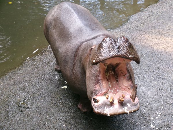 カバに餌やりできた!!初めての体験だった!こうやって口を広げてくれて、キャベツ投げ入れる!かわいい!でかすぎる!!