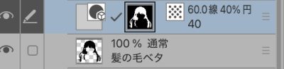 さっきの黒ベタ部分を選択して、上からトーンを貼ります。